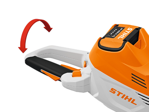 Mit nur einem Knopfdruck kann der Multifunktionsgriff um 90° nach links oder rechts gedreht werden. So arbeiten Sie in jeder Schnittrichtung besonders ergonomisch – ideal beim Schneiden von Heckenseiten und -oberseiten. Die HSA 100 lässt sich komfortabel mit der linken oder rechten Hand bedienen, und der Bügelgriff reduziert zusätzlich die Ermüdung. Das STIHL Antivibrationssystem minimiert Motorvibrationen und schont so Muskeln und Gelenke bei langen Einsätzen.